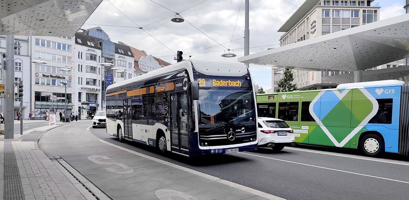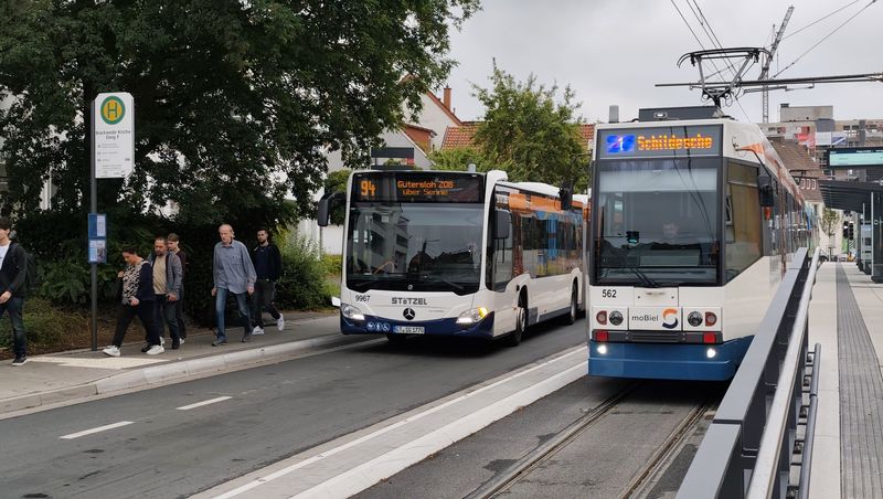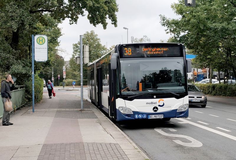 Bielefeld má také rozvinutou autobusovou dopravu pod hlavičkou moBiel a provozovanou buď místním dopravním podnikem nebo subdodavateli. Linky jsou číslovány od 21 výše a spolu tvoří jednotlivé linky svazky se společnou částí trasy i stejnou barvou linky. Většina linek nevede až do centra, ale navazují na Stadtbahn. Linky směřující do centra jedou přes centrální přestupní zastávku Jahnplatz kousek od historického centra i Hlavního nádraží. Tady se také potkávají noční linky číslované od N1 výše, které nahrazují také Stadtbahn. Dopravní podnik moBiel provozuje flotilu o velikosti cca 160...Bielefeld má také rozvinutou autobusovou dopravu pod hlavičkou moBiel a provozovanou buď místním dopravním podnikem nebo subdodavateli. Linky jsou číslovány od 21 výše a spolu tvoří jednotlivé linky svazky se společnou částí trasy i stejnou barvou linky. Většina linek nevede až do centra, ale navazují na Stadtbahn. Linky směřující do centra jedou přes centrální přestupní zastávku Jahnplatz kousek od historického centra i Hlavního nádraží. Tady se také potkávají noční linky číslované od N1 výše, které nahrazují také Stadtbahn. Dopravní podnik moBiel provozuje flotilu o velikosti cca 160 vozidel, v naprosté většině značky Mercedes-Benz. Starší autobusy jsou naftové, novější hybridní a nejnovější vodíkové elektrobusy – aktuálně jich tu mají 29, z toho 17 kloubových + 8 standardních modelů eCitaro a k tomu ještě 4 vodíkové elektrobusy Caetano. Městské autobusy jezdí v modrooranžovobílé barevné kombinaci, a to včetně subdodávek. Regionální autobusy zajíždějící do centra jsou ukončeny u Hlavního nádraží.