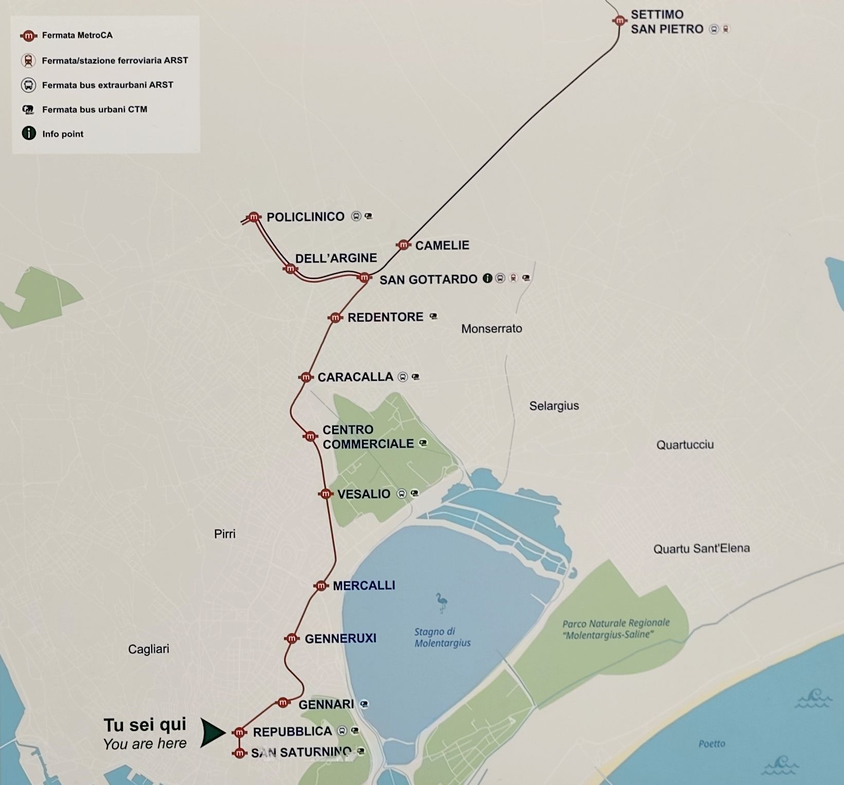 Do centra Cagliari zajíždí také místní regionální železnice propojující jih se severem ostrova. Vlaky na normálním rozchodu provozují italské státní dráhy FS a chystá se elektrifikace páteřní dvoukolejné trasy z Cagliari. Na to už jsou připraveny nové hybridní vlakové jednotky Hitachi, které umí kombinovat elektrický a naftový pohon. Díky souhrnnému intervalu 20 minut se pomocí vlaků dostanete rychle také na místní nedaleké letiště Elmas, u kterého vyrostla v roce 2013 nová zastávka. Hned u vlakového nádraží najdete kromě obratiště linek MHD také autobusové nádraží pro regionální spoje...Do centra Cagliari zajíždí také místní regionální železnice propojující jih se severem ostrova. Vlaky na normálním rozchodu provozují italské státní dráhy FS a chystá se elektrifikace páteřní dvoukolejné trasy z Cagliari. Na to už jsou připraveny nové hybridní vlakové jednotky Hitachi, které umí kombinovat elektrický a naftový pohon. Díky souhrnnému intervalu 20 minut se pomocí vlaků dostanete rychle také na místní nedaleké letiště Elmas, u kterého vyrostla v roce 2013 nová zastávka. Hned u vlakového nádraží najdete kromě obratiště linek MHD také autobusové nádraží pro regionální spoje provozované dopravcem ARST. Ten v poslední době výrazně obnovil svoji flotilu tmavě modrými autobusy značek Iveco a Solaris